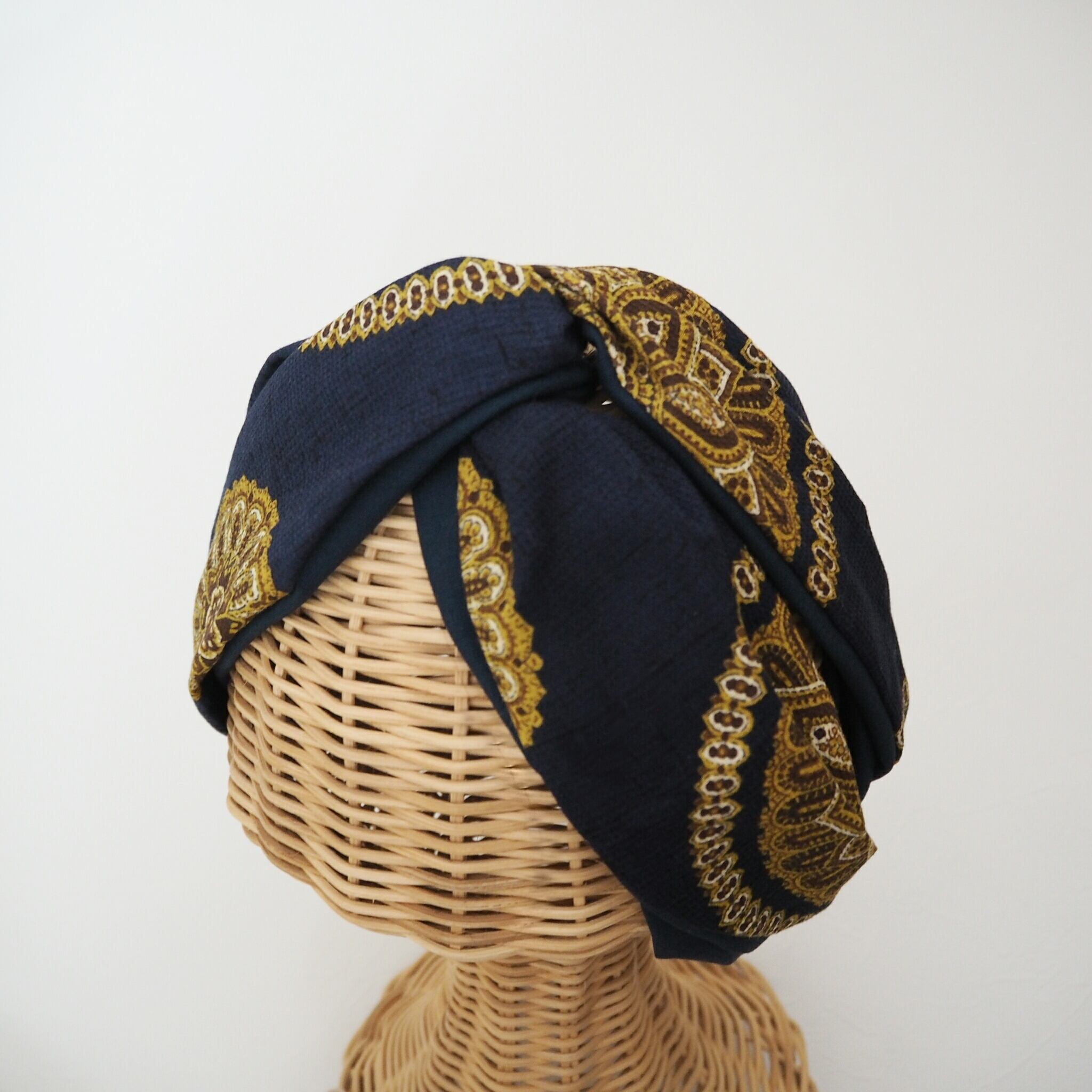 紺色ベースにゴールドの模様が素敵な生地とネイビーの生地を切り替えて作った結び目の様な二本使いのヘアバンドです。