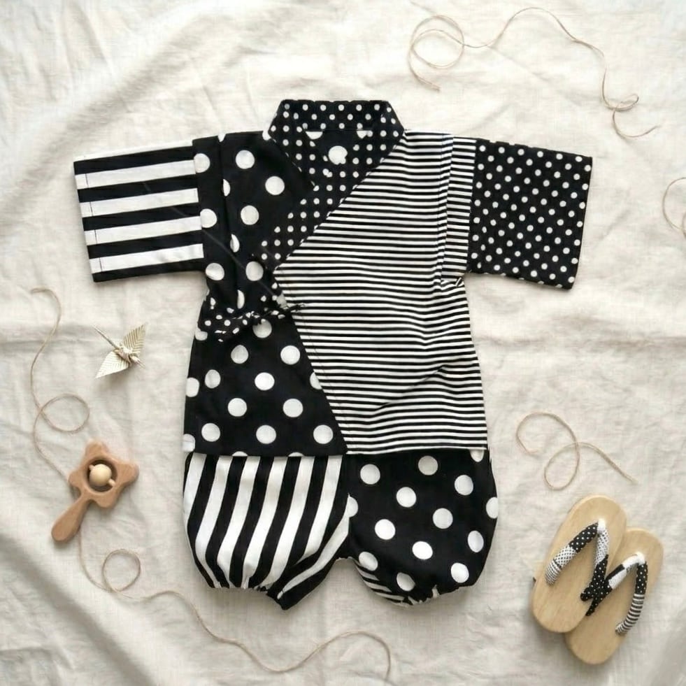 モノトーンの水玉とストライプボーダー組み合わせで作った、シンプルながらも個性的な印象を与えてくれる赤ちゃん用の浴衣(甚平)です。
