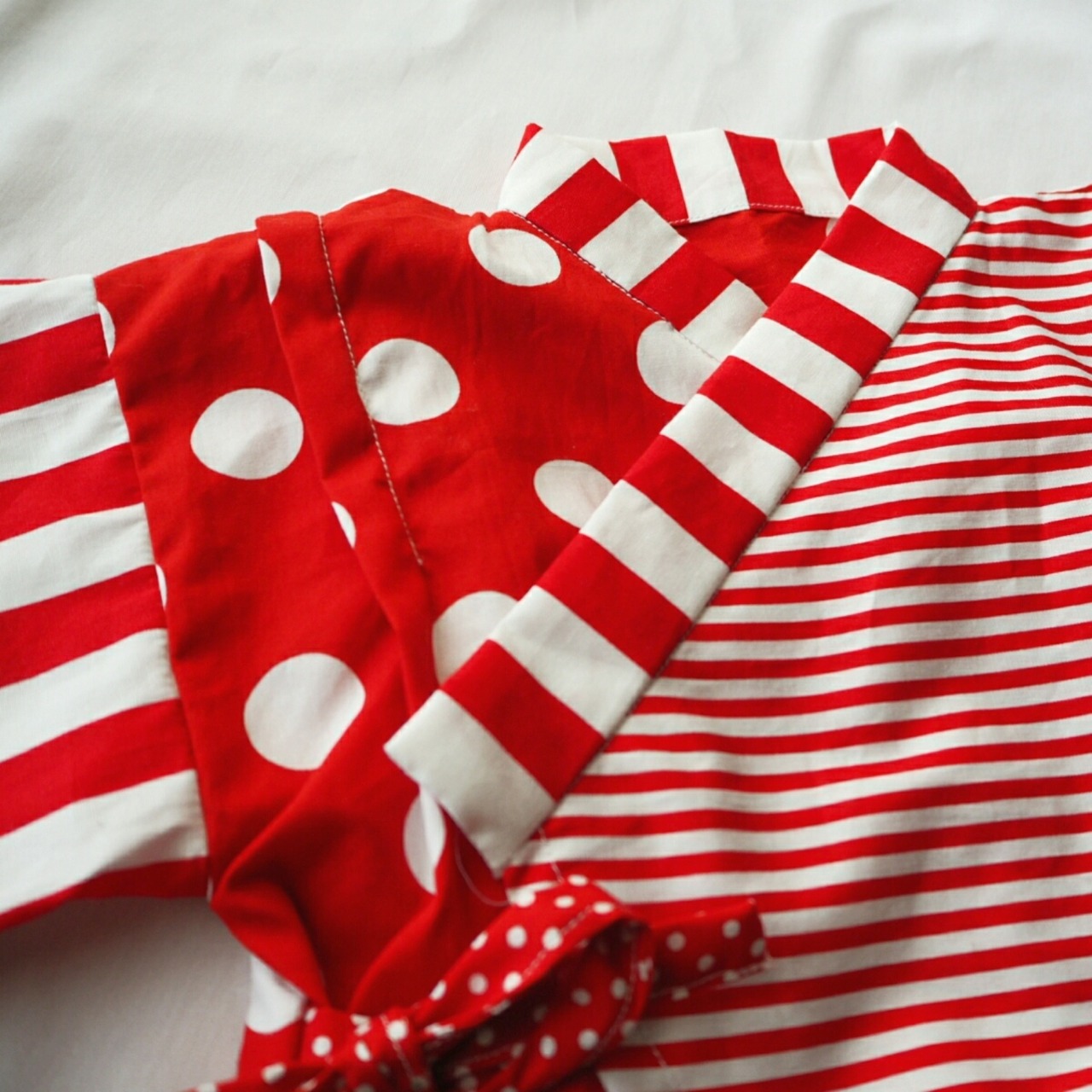 ドットと太×細ストライプボーダーの組み合わせで作った、浴衣(甚平)赤バージョンです。