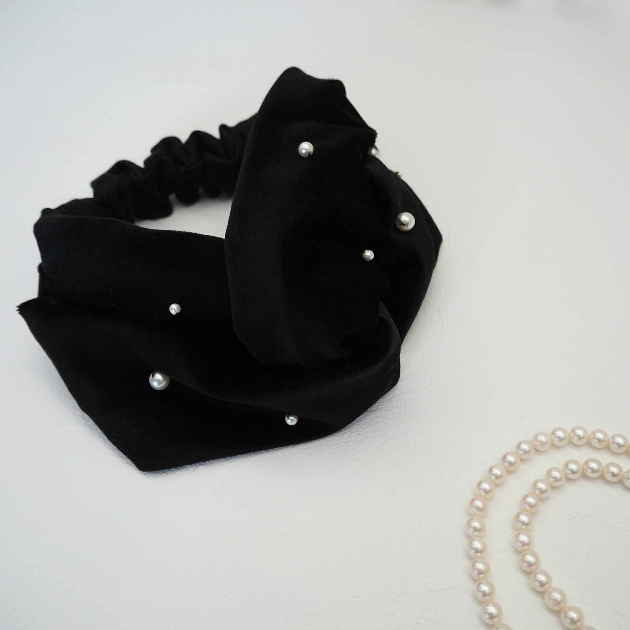 光沢感のある上品なベロア生地使用した結び目の様な二本使いのヘアバンドにパールビーズを装飾しました。
