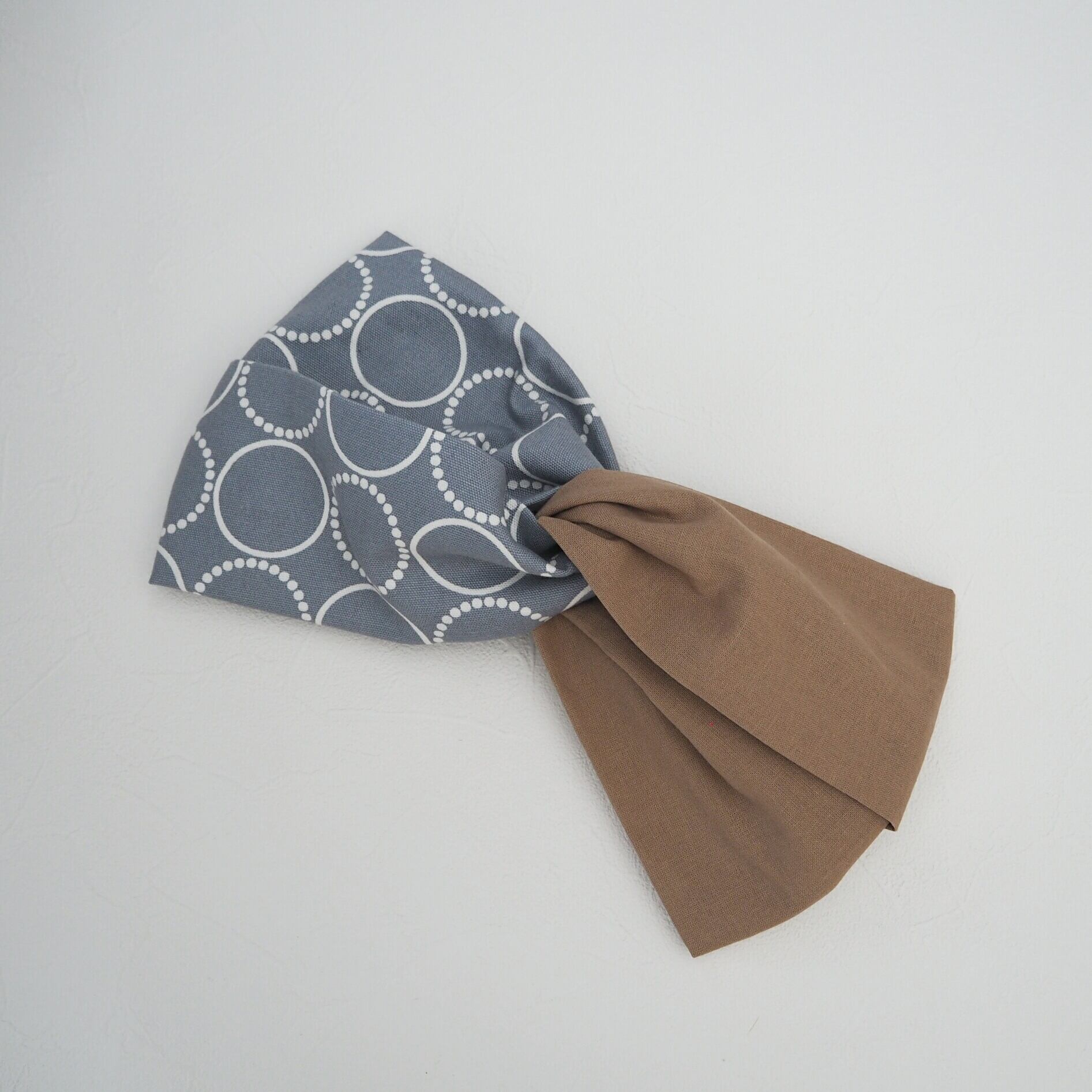 ライトグレーに白の丸いドットプリントの可愛らしい綿生地とベージュを組み合わせた結び目の様な二本使いのヘアバンドです。