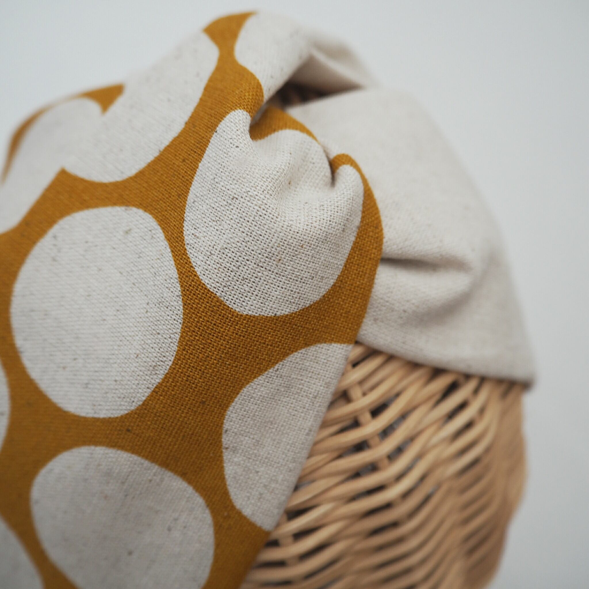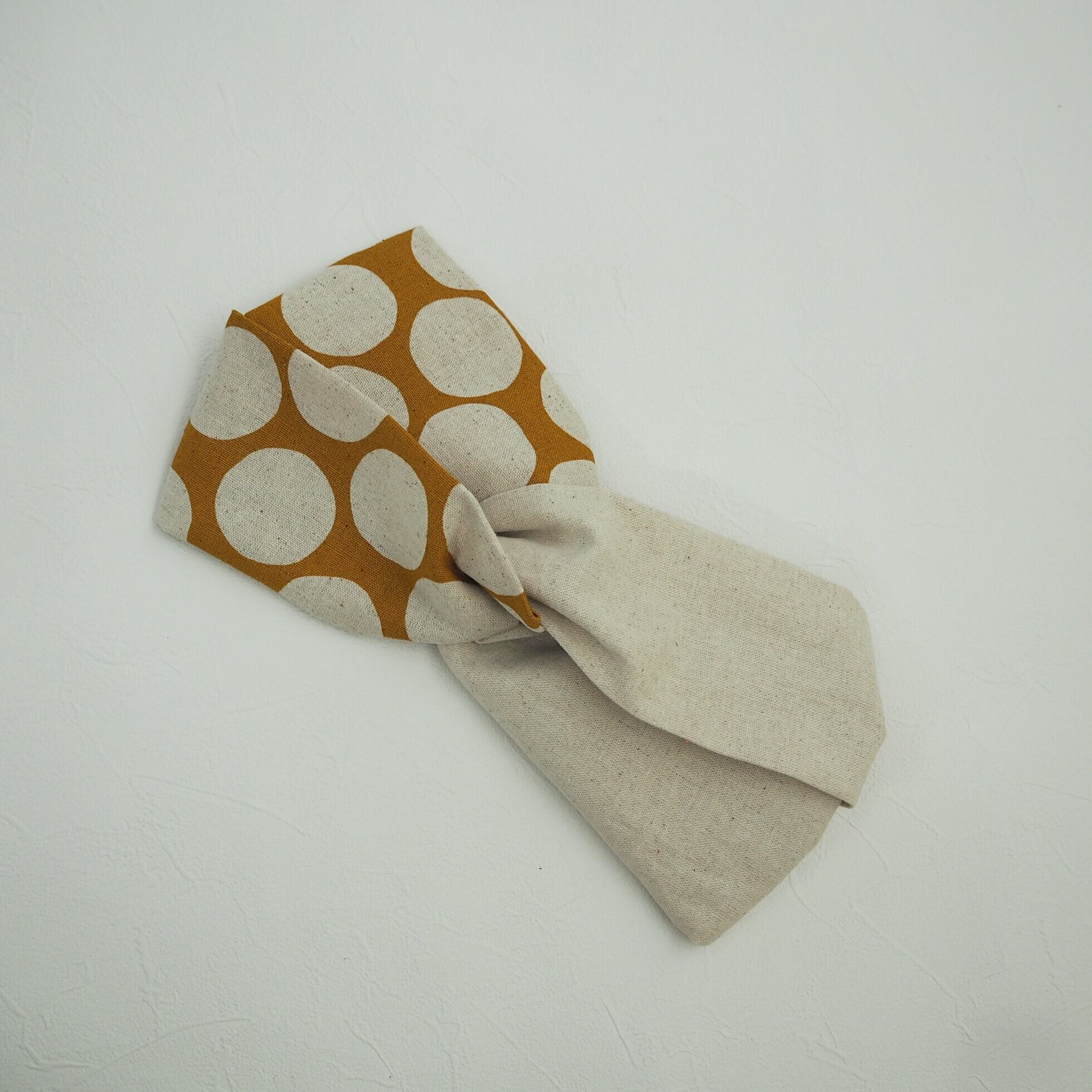 マスタードイエローベースの水玉とナチュラルな綿麻生地を組み合わせた結び目の様な二本使いのヘアターバンです。
