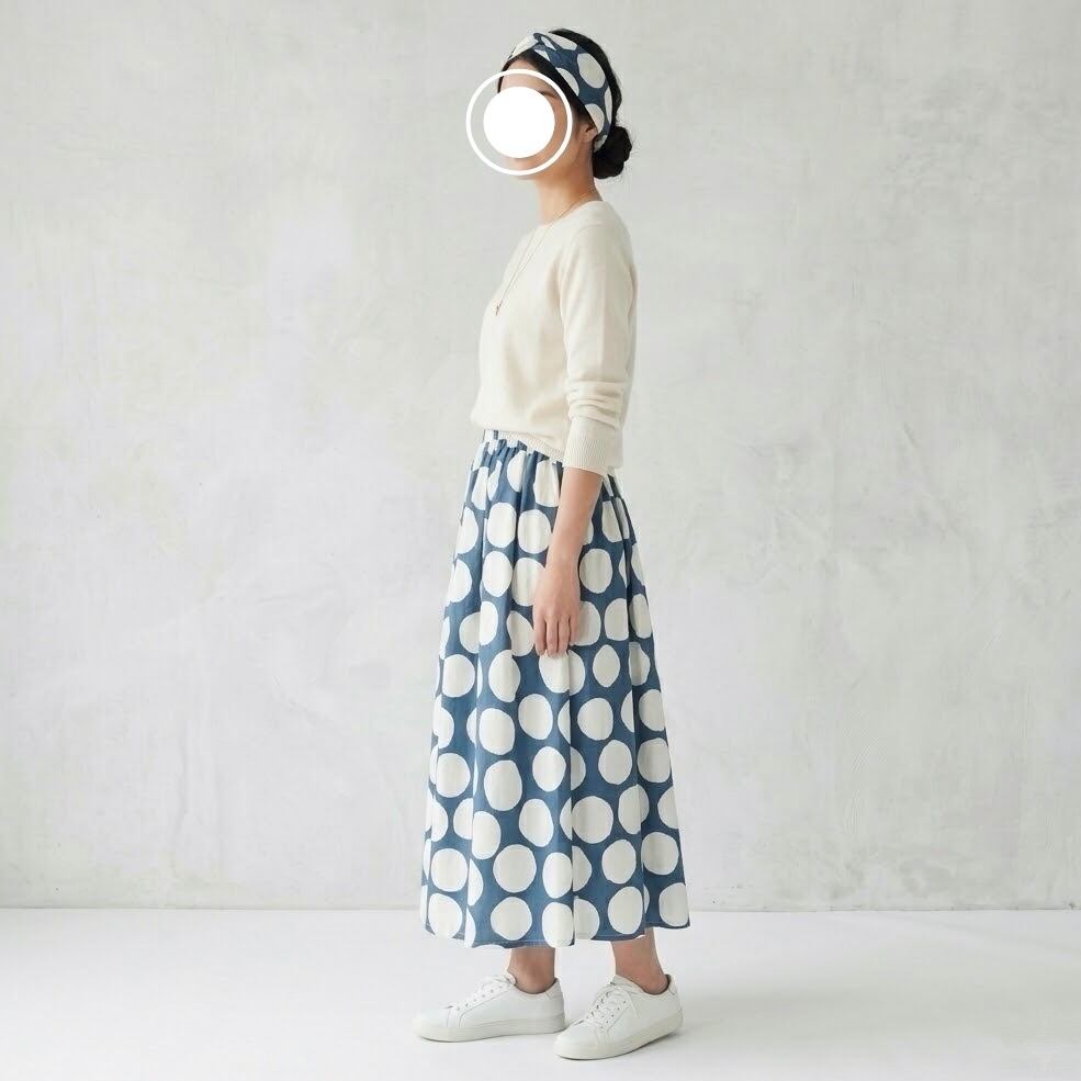 大きな水玉が目をひく落ち着いたくすみ系の青の綿素材で作ったロングスカートです。