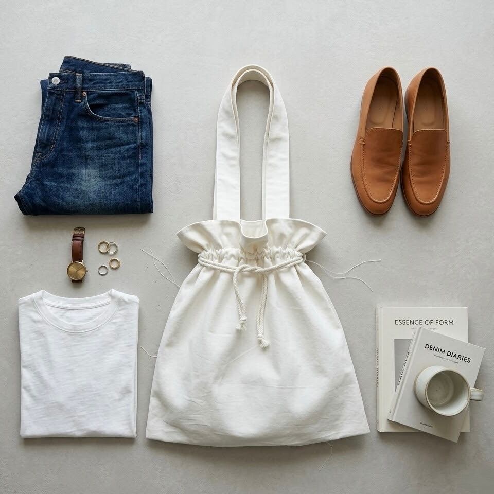パッと目を引く真っ白な巾着型のトートバッグの再販売、今回は薄手のホワイトデニム生地です。