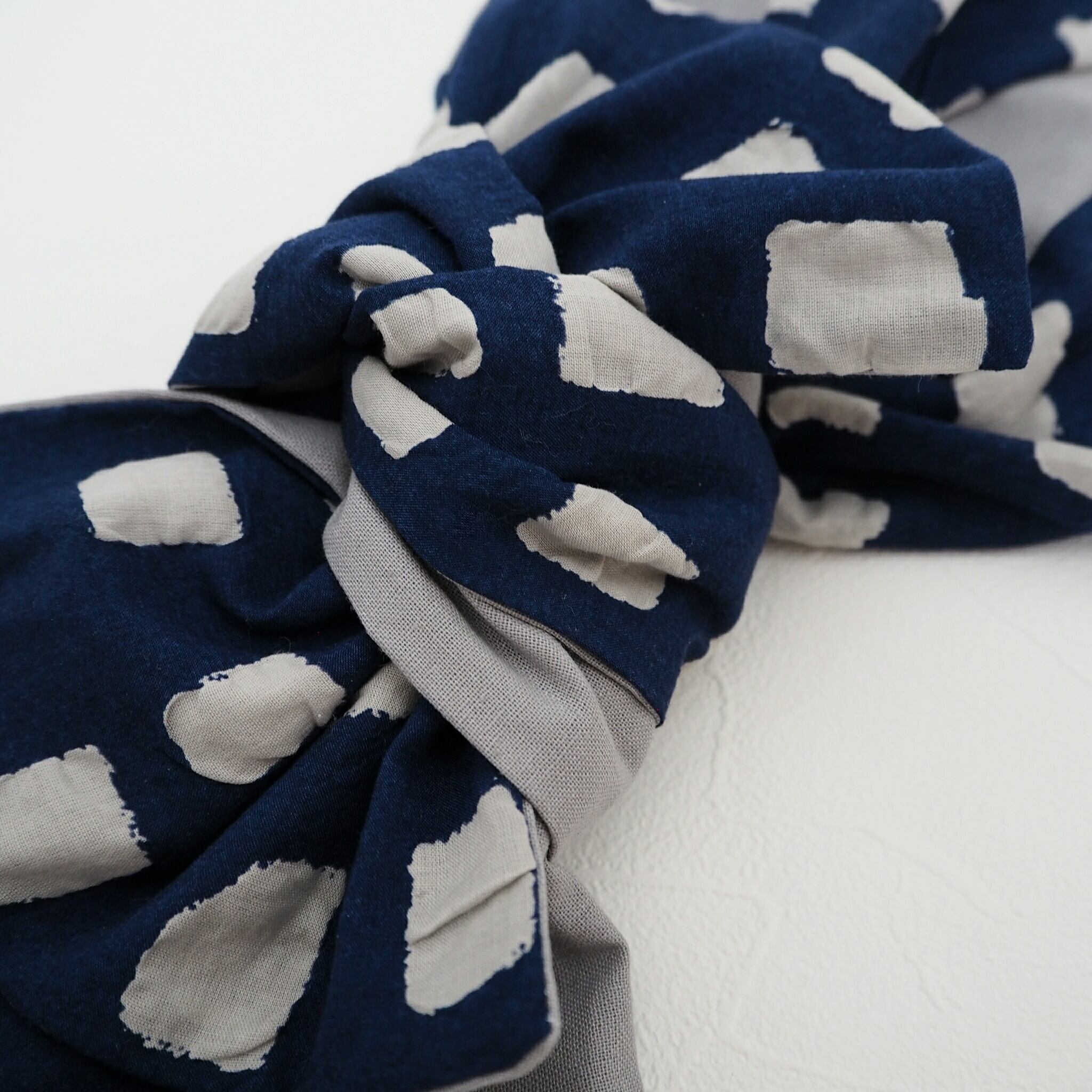 ネイビーベースにライトグレーのキューブがプリントされた生地と無地のライトグレー生地を組み合わせて作った、結び目の様な二本使いのヘアターバンです。