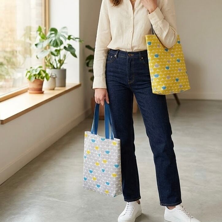 黄色とグレーの半円プリントの可愛らしい生地で作った、ざっくりトートバッグです。