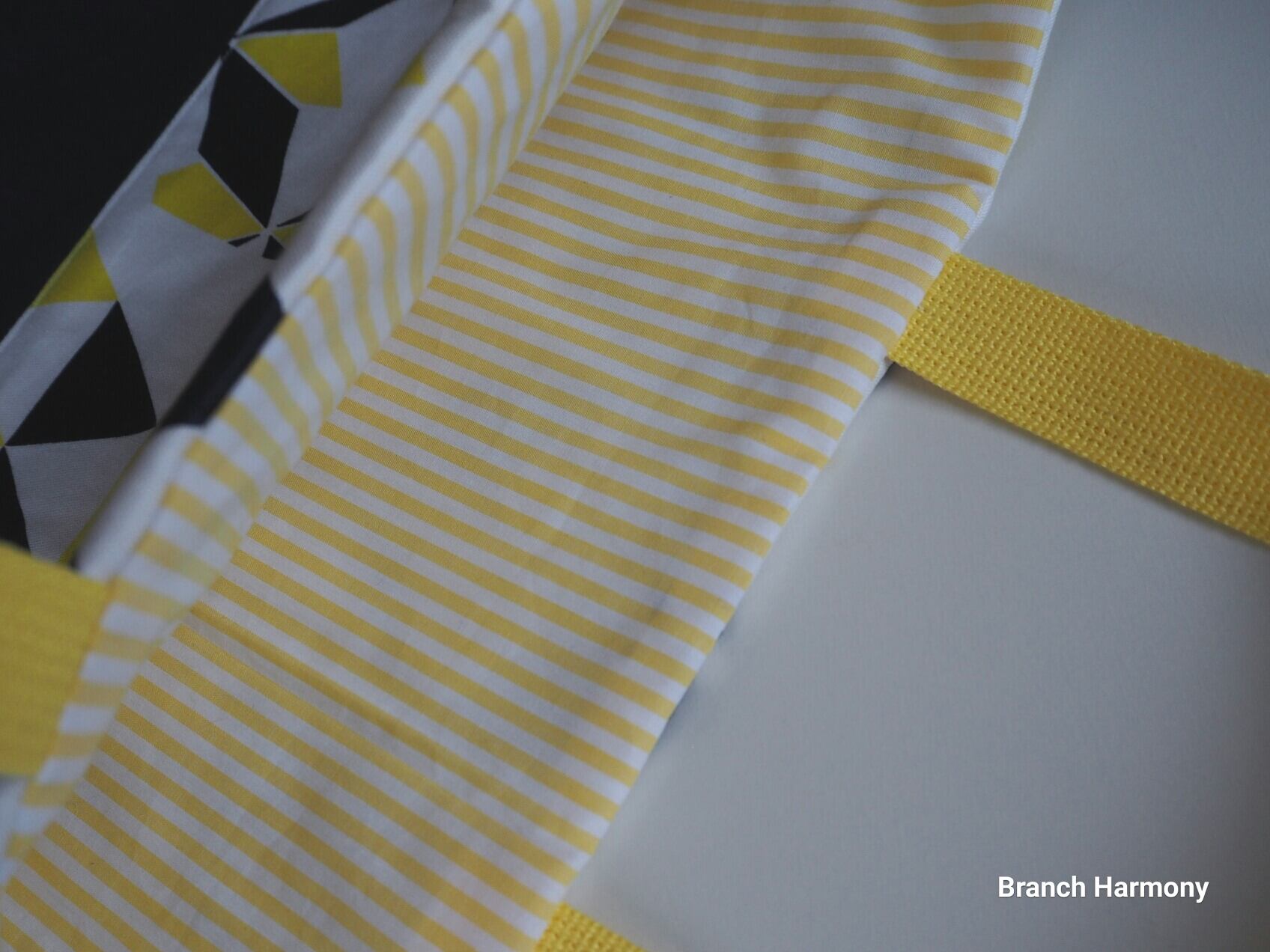 裏地は黄色と白のストライプで持ち手も黄色にしました。