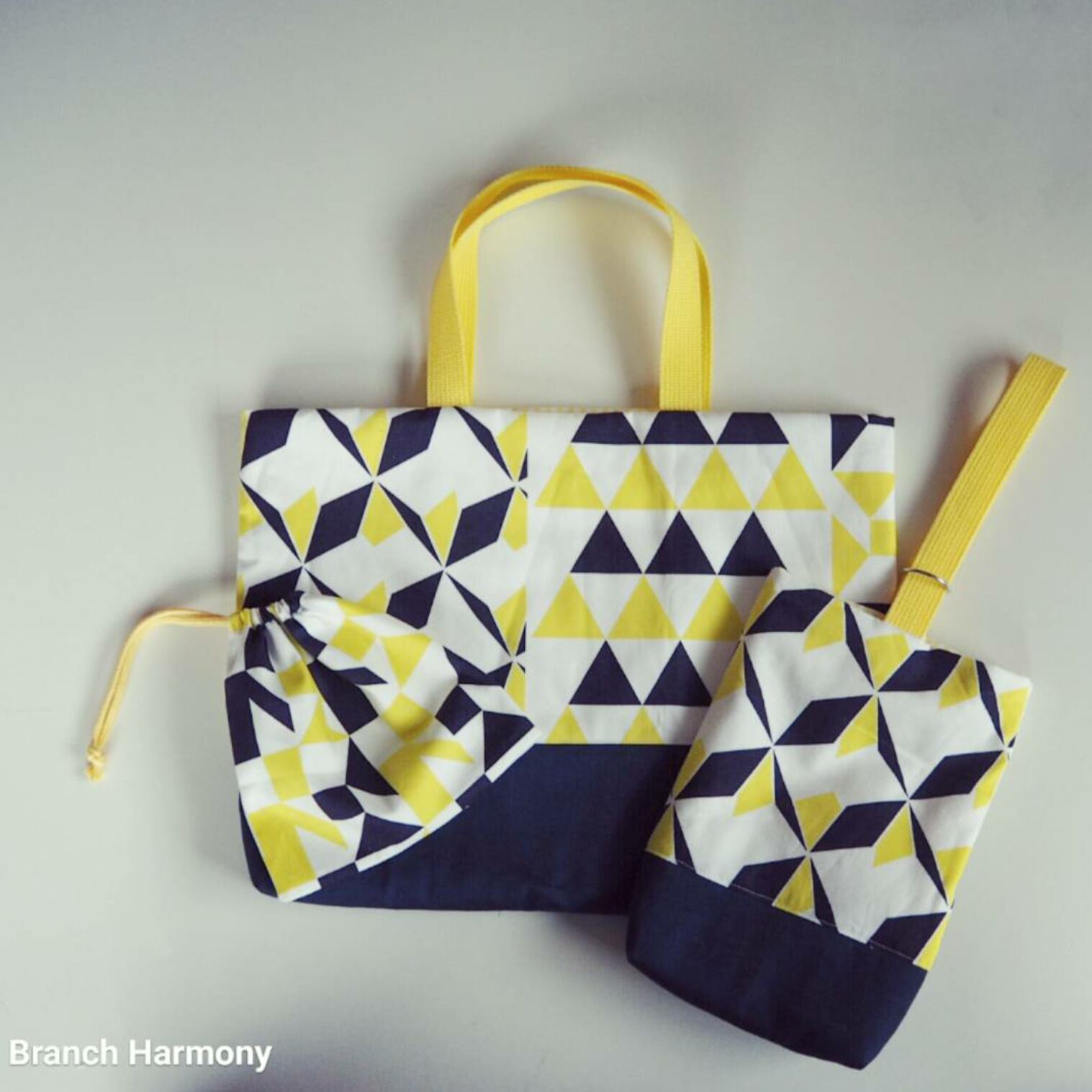 レモンイエローとネイビーの幾何学模様が目を引く生地と無地のネイビー生地を組み合わせて通園通学にも便利な手提げバッグ、シューズバッグ、コップ入れ等にちょうど良い巾着袋を作りました。