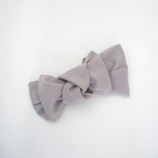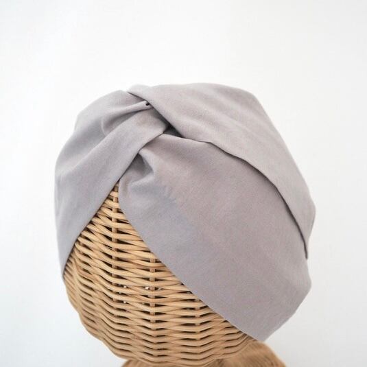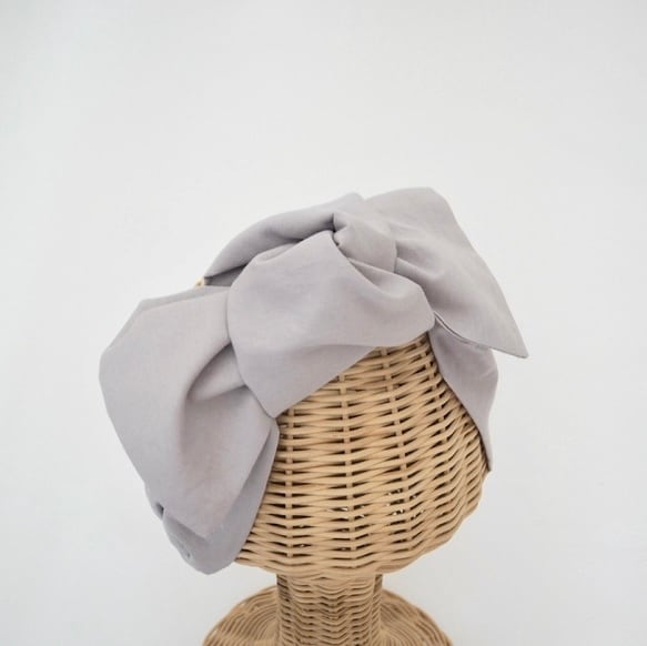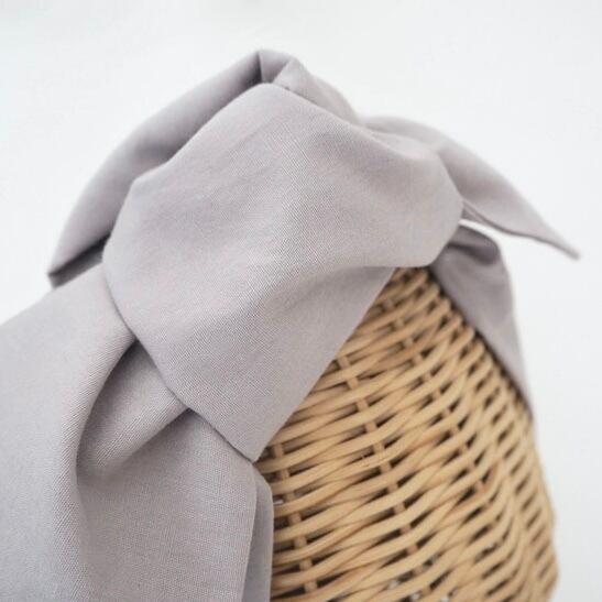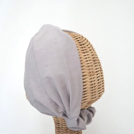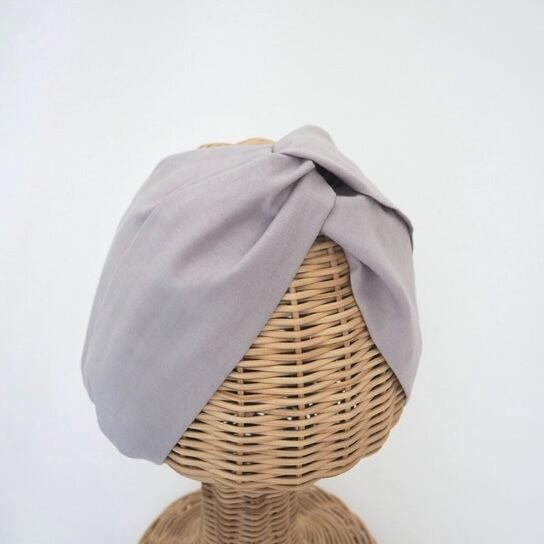 淡いグレージュ色が素敵な、少し洗いをかけたようなくたっとした綿素材を使用した結び目の様な二本使いのヘアバンドです。